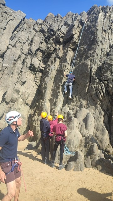On Wednesday the students visited a sunny Three Cliffs Bay. Students from both schools were able to see the results of this geographical process whilst undertaking geography fieldwork on the storm beach. Alongside the fieldwork, students walked through the sea arch they had learnt about on Monday before experiencing the eroded cliffs up close during a rock climbing activity organised by local adventure company RipNRock. Students showed excellent team working and communication skills as they worked together to help each other up and down the steep rock face
